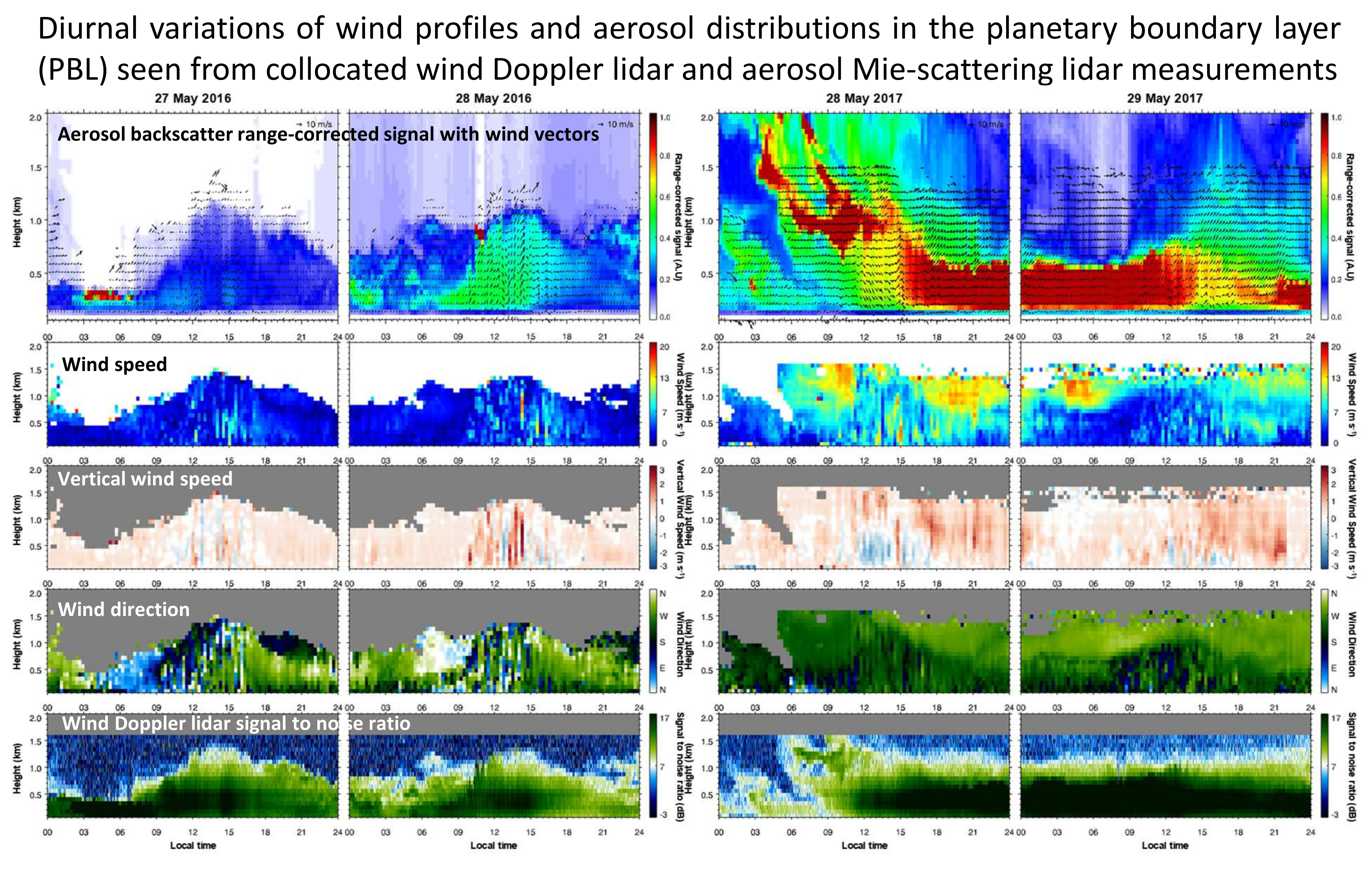 유성 경계층 (PBL)에서 바람 프로파일의 정확한 측정은 수치 기상 예측뿐만 아니라 대기 품질 모델링에서도 중요합니다. 스캐닝 도플러 광 검출 및 거리 측정 (라이더) 측정을 사용하는 두 가지 바람 검색 방법을 비교하고 동시 라디오 존데 음향으로 검증했습니다. 17 개의 라디오 존데 (radiosonde) 사운드 프로파일을 비교해 보면 사인 피팅 방법이 더 많은 수의 데이터 포인트를 검색 할 수 있다는 것을 보여 주었지만 특이 값 분해 방법은 바이어스 (0.57 ms -1 )와 평균 제곱근 오차 (1.75 ms -1)와 라디오 존데 soundings. 속도 방위각 디스플레이 스캔을 얻기 위해 방사 속도의 평균 시간 간격을 15 분으로 늘리면 소음에 대한 평균 신호 효과로 인해 라디오 존데 소리와 더 잘 일치하게됩니다. 나란히 놓인 윈드 도플러 라이더와 에어러솔 미사 산란 라이저에서 동시에 측정 한 결과 PBL 바람의 시간적 변화와 PBL 내 에어러솔의 수직 분포가 나타났다.
