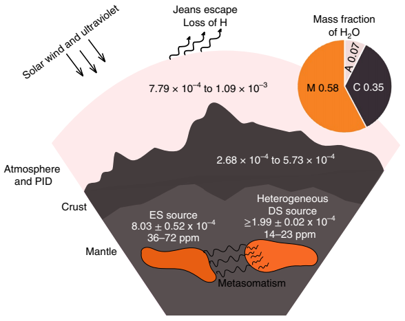 화성 안팎의 현재 수소 저장소를 보여주는 그림. 화성 수의 질량 분율 (파이 차트)은 벌크 크러스트 (C), 맨틀 (M) 및 대기와 극지 얼음 침전물 (PID)의 결합 된 인벤토리 (A)의 물 질량을 기준으로합니다. 맨틀 질량 분율은 고갈 된 세르 고이 트 (DS)와 농축 세르 고트 (ES)의 조합입니다. 이미지 크레디트 : Barnes et al, doi : 10.1038 / s41561-020-0552-y.