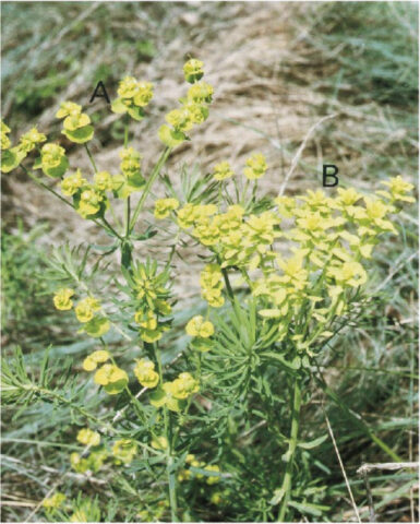 가짜 꽃 형성은 식물과 곰팡이 상호 작용 중 드문 현상이다. 녹병균 종류인 우로미시스 피시(Uromyces pisi)는 솔잎대극(Euphorbia cyparissias)을 감염시킨다. 잎을 변형시켜 솔잎대극과 다른 노란 잎의 장미 형태 가짜 꽃을 만든다. A는 감염되지 않은 솔잎대극, B는 녹병균인 우로미시스 피시에 감염돼 노란 잎에 로제트를 형성한 가짜 꽃 ⓒMonika Pfunder, Botanical Society of America, doi.org/10.2307/2656684