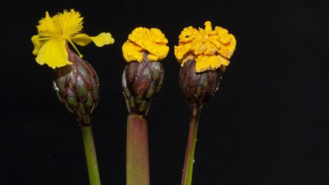 어떤 꽃이 진짜일까? 가장 왼쪽이 정상적인 자이리스 꽃, 나머지 두 개는 자이로필름이 만들어 낸 가짜 꽃이다. ⓒ K. Wurdack , Smithsonian Institution