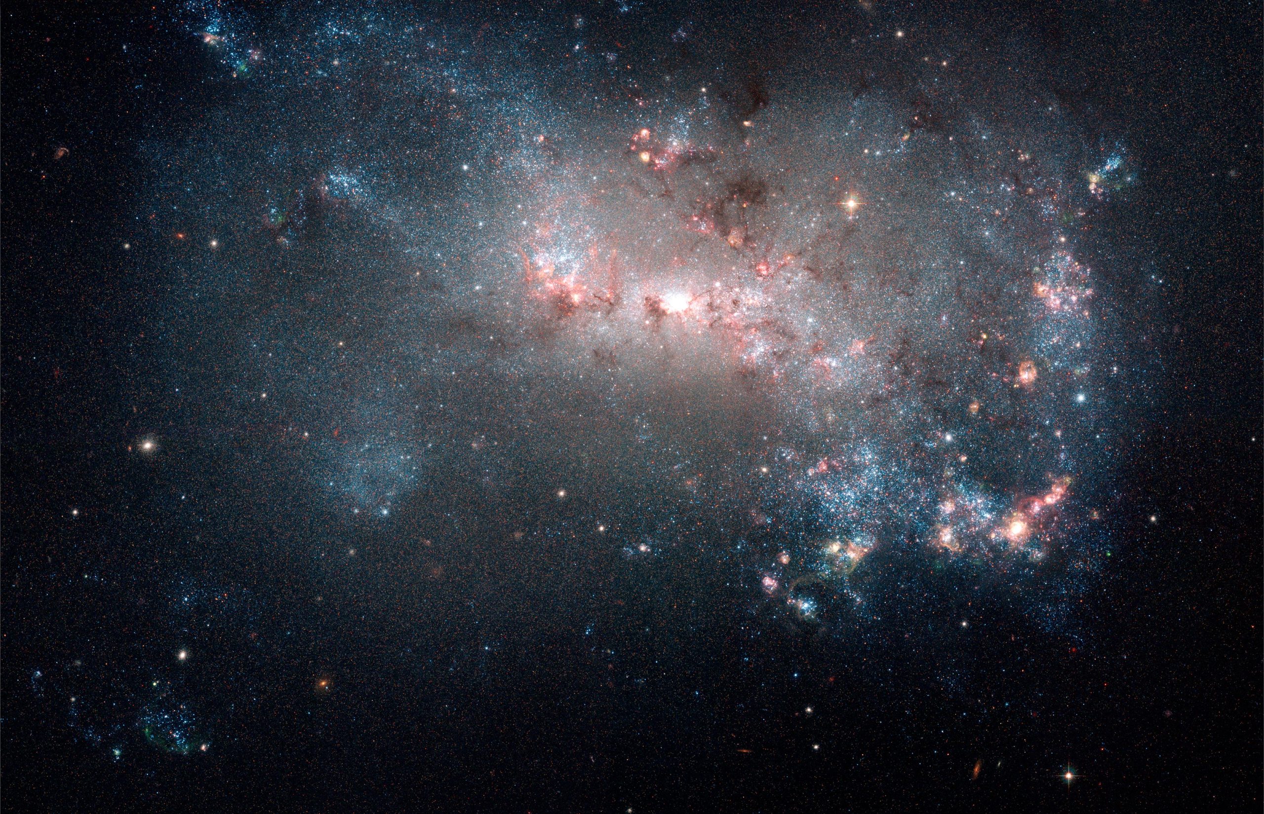 이 은하는 에너지로 가득 차 있습니다. NGC 4449는 현재 엄청난 속도로 새로운 별들을 형성하고 있는데, 이는 같은 크기의 은하에서 예상보다 훨씬 빠른 속도입니다. 그래서 이 은하는 폭발적 항성 생성 은하로 알려져 있습니다. NGC 4449를 더욱 특이하게 만드는 것은 별 형성이 중심부에만 국한되지 않는다는 점입니다. 밝고 어린 별들이 은하계 곳곳에 흩어져 있습니다. 과학자들은 이러한 광범위한 별 활동이 근처 은하와의 중력적 상호작용에 의해 촉발되었다고 생각합니다. NGC 4449는 매우 가깝기 때문에 은하들이 서로에게 어떤 영향을 미치고 그 과정에서 별이 어떻게 탄생하는지 연구할 수 있는 희귀하고 귀중한 기회를 제공합니다.