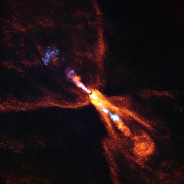 파란색 제트는 우리를 향해 움직이고 있고, 빨간색 제트는 멀어지고 있습니다. James Webb Space Telescope(JWST)로 관찰한 결과 약 10km/s로 움직이는 SiO의 흔적이 보입니다. 하지만 이 ALMA 이미지에서 보이는 SiO 제트는 약 10배 더 빠르게 움직입니다. 이는 느리게 움직이는 SiO가 별 주위의 작은 영역, 즉 태양 주위의 소행성대 크기에 위치해야 한다는 것을 의미하는데, 이 이미지에서는 너무 작아서 볼 수 없습니다.